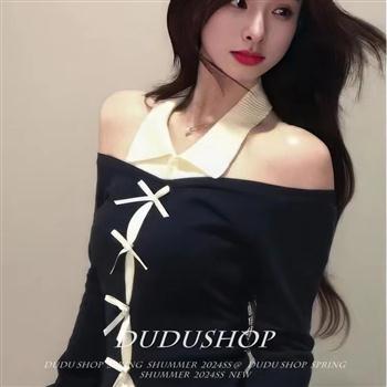 YF3835-图片色假两件POLO领二色拼接系蝴蝶结小可爱气质针织上衣