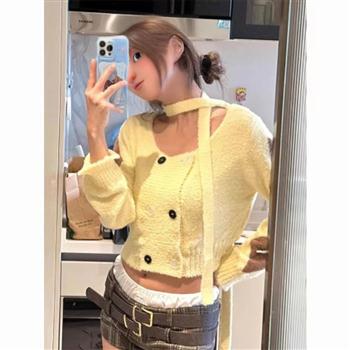 YF3838-图片色韩版冬季新款围巾撞色系扣穿绳长袖小众针织毛衣外套