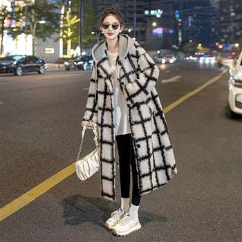 YF3839-图片色黑白格子大衣 长袖连帽宽松大码羊羔绒加厚慵懒风韩版毛呢外套