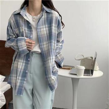 YF3843-图片色港式慵懒风个性口袋设计加大码显瘦复古格子衫 chic韩潮衬衫