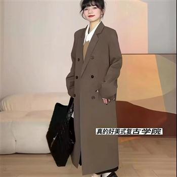 YF3845-(3色入内)韩版定制长袖翻领双排扣中长款过膝长款西装外套 休闲风衣