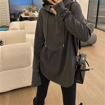 YF3837-(2色入内)慵懒风长袖连帽拉链弧边设计休闲卫衣潮 学院风大码T恤