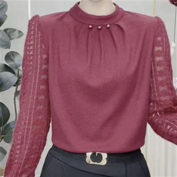 YF3848-(3色入内)名媛气质钉珠围脖褶折设计镂空提花长袖半高领蕾丝上衣