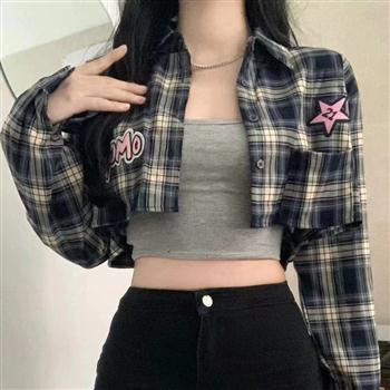 YF3852-图片色时尚辣妹新款设计R字贴标复古格子衫 露脐短款宽松上衣