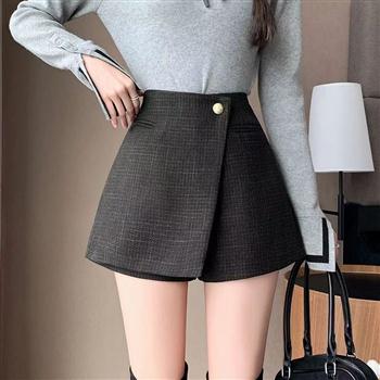 YF3850-(3色入内)时尚新款不规则系扣假两件裙摆高腰阔脚裤 冬季毛呢裙裤