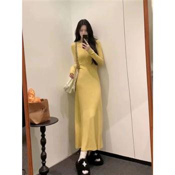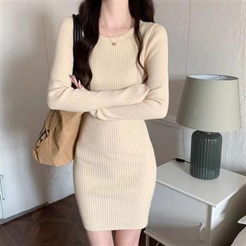 YF3857-(2色入内)小心机套手指长袖套头弧边修腰包臀纯色毛衣连衣裙
