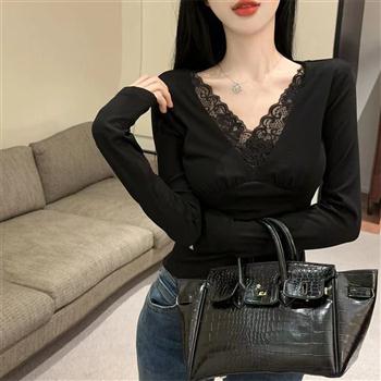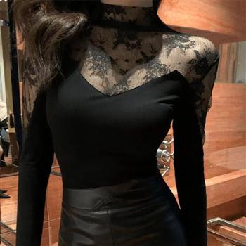 YF3862-图片色名媛气质网纱拼接长袖半高领弹力紧身百搭黑色蕾丝衫