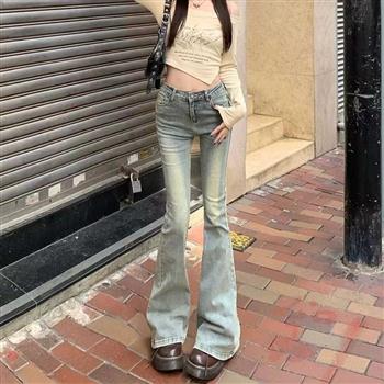 YF3858-图片色港式系扣高腰微喇叭做旧洗水弹力包臀显瘦坠地感牛仔裤