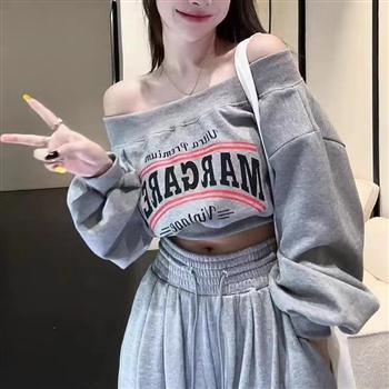 YF3860-(3色入内)螺纹一字肩字母印花慵懒风长袖套头两穿宽松大码卫衣潮