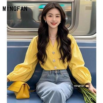 YF3855-图片色甜美时尚泡泡袖V领系扣轻奢宽松大码黄色秋冬气色衬衫
