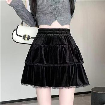 YF3856-图片色甜美金丝绒荷叶边A字蓬蓬裙 韩版松紧腰显瘦防走光短裙