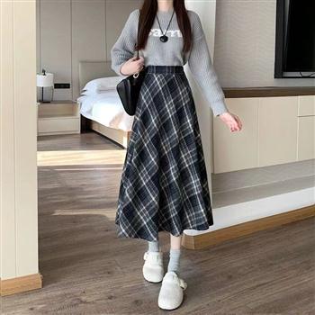 YF3866-(2色入内)冬季复古菱型格子裙 学院风保暖毛呢中长款半身裙