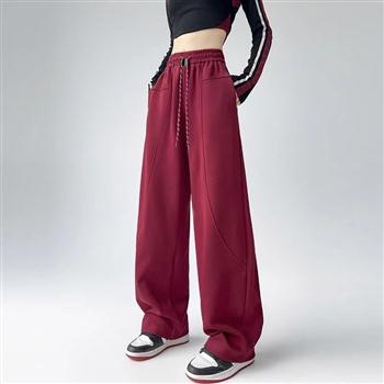 YF3861-(4色入内)2024新款松紧腰抽绳弧边拼接阔脚裤 弯刀设计运动卫衣裤