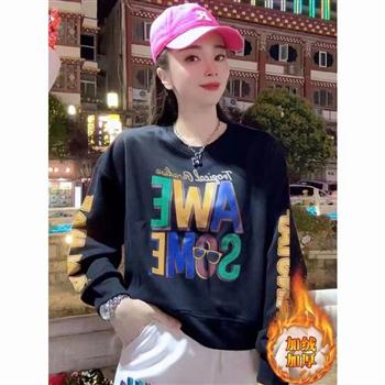 YF3865-(4色入内)港式慵懒风圆领长袖字母彩色印花加绒胖MM大码显瘦卫衣