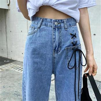 YF3680-图片色韩版小众设计侧交叉绑绳直筒坠地复古蓝休闲牛仔裤