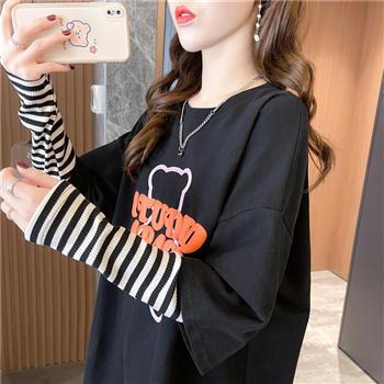 YF3681-(3色入内)2024新款条纹拼接假两件T恤 圆领套头宽松大码卫衣潮