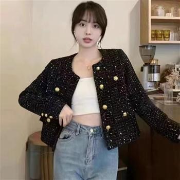 YF3683-(3色入内)小香风冬季新款长袖系扣缇花格子别致名媛气质呢子外套