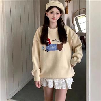 YF3684-(3色入内)小可爱腊肠狗刺绣圆领长袖宽松大码休闲美式针织毛衣外套