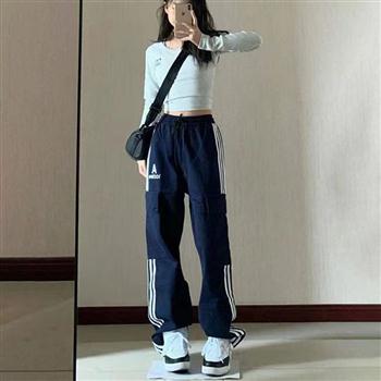 YF3685-(2色入内)学院风A字母印花松紧腰绑绳侧条纹工装美式休闲裤