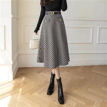 YF3690-图片色优雅名媛气质复古格子毛呢双口袋设计中长款高腰显瘦半身裙