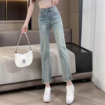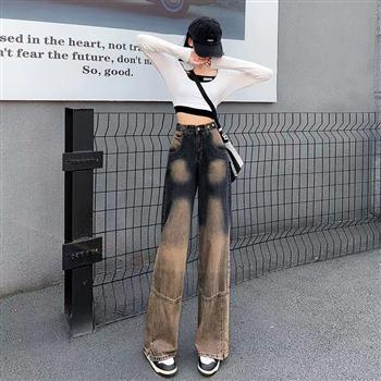 YF3691-图片色港式慵懒风洗水做旧系扣高腰拼接开叉坠地感ins牛仔裤