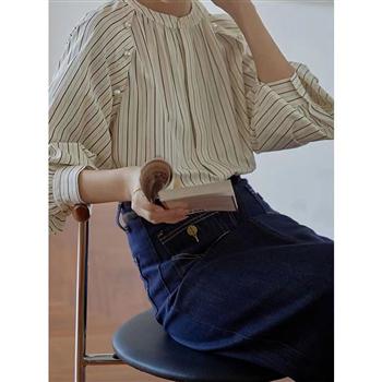 YF3693-图片色小可爱珍珠扣长袖连肩立领条纹宽松大码别致温柔风衬衫