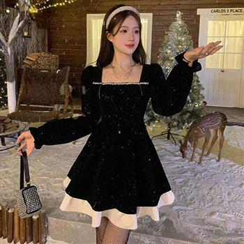 YF3694-(2色入内)甜美公主裙 2024秋冬新款闪闪亮泡泡袖花边领束腰拼色连衣裙