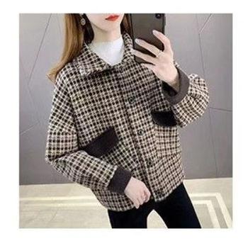 YF3686-图片色秋冬复古格子外套 韩版长袖POLO领系扣宽松大码毛呢上衣