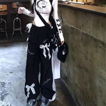 YF3687-图片色韩版系蝴蝶结印花侧条纹蕾丝设计感坠地感直筒高腰休闲裤