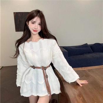 YF3697-图片色甜美时尚波浪纹镂空两穿露肩宽松大码瘦身长袖针织外套