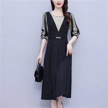 YF3699-图片色优雅时尚条纹长袖V领二色拼接束腰褶折中长款假两别致连衣裙