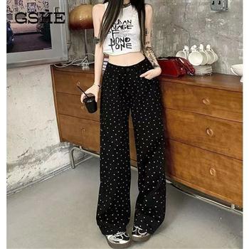 YF3703-图片色时尚个性波点印花系扣直筒坠地感复古碎花韩版牛仔裤