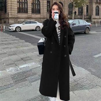 YF3702-(4色入内)冬季韩版长袖西装领双排扣中长款加厚毛呢大衣 休闲百搭风衣