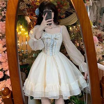 YF3706-图片色甜美公主蕾丝连衣裙 优雅时尚秋冬长袖方领绑束胸蓬蓬裙
