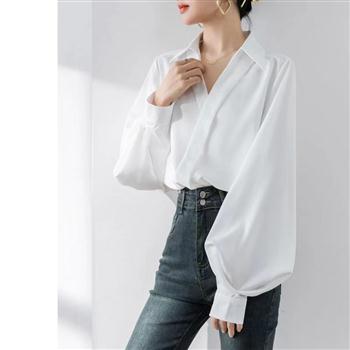 YF3707-(2色入内)春秋小众设计泡泡袖翻领交叉叠式宽松大码复古气质雪纺衫
