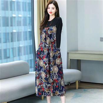 YF3708-(2色入内)时尚图腾印花小众设计假两件藏肉显瘦碎花连衣裙
