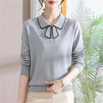 YF3710-(2色入内)名媛钉珠长袖POLO领缇花镂空设计蝴蝶结新款针织毛衣外套