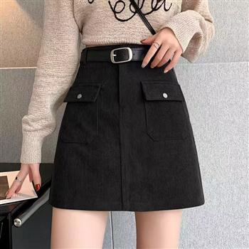 YF3712-(2色入内)冬装新款系扣高腰双口袋A字灯芯绒防走光A字短裙