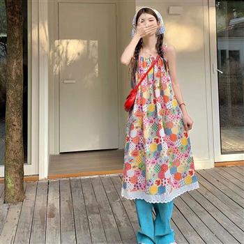 YF3713-图片色小可爱田园风吊带抽绳碎花宽松A字藏肉休闲瘦身连衣裙