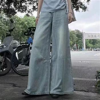 YF3714-图片色港款蓝色洗水牛仔裤 慵懒风坠地休闲高腰显瘦阔腿裤
