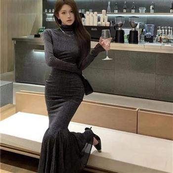 YF3715-图片色优雅2024宴会礼服裙 轻奢熟女长袖套头弹力包臀褶折鱼尾裙