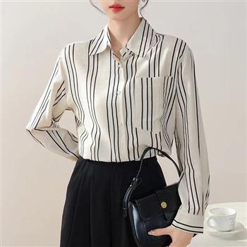 YF3716-图片色简约素色条纹长袖翻领宽松大码显瘦休闲百搭衬衫