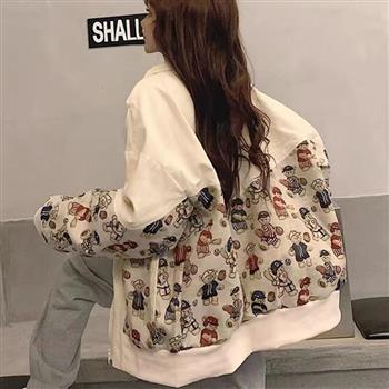 YF3543-(2色入内)慵懒风长袖POLO领拉链可爱熊印花拼接宽松大码夹克外套