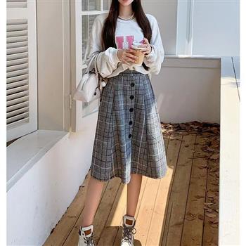 YF3544-(2色入内)秋冬英伦风收腹高腰排扣A字格子裙 复古设计毛呢半身裙