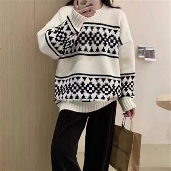 YF3547-(3色入内)韩版小可爱菱形缇花宽松大码慵懒风港味圆领长袖针织衫