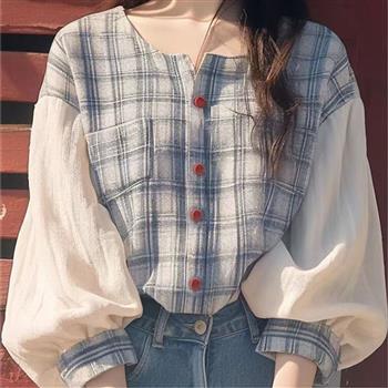 YF3548-图片色复古泡泡袖格子拼接宽松大码小众设计感休闲百搭秋季新品