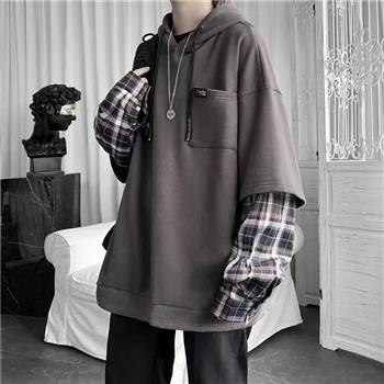 YF3549-(3色入内)慵懒风秋冬复古格子拼接胖MM加大码学院风长袖连帽卫衣