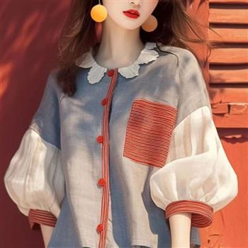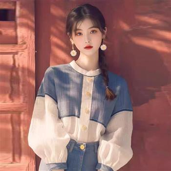 YF3556-图片色韩版秋季新款泡泡袖套头系扣宽松大码二色拼接小众设计感衬衫