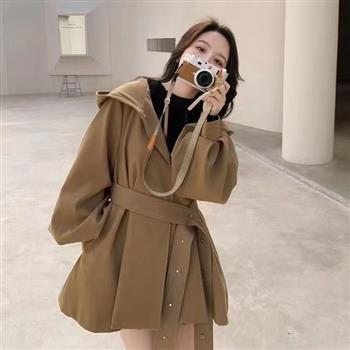 YF3551-(2色入内)赫本风小心机设计泡泡袖连帽绑带束腰宽松大码风衣