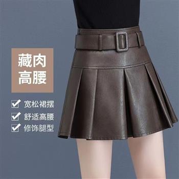 YF3542-(3色入内)秋冬松紧腰褶折荷叶边A字PU皮蓬蓬裙 防走光蛋糕型短裙